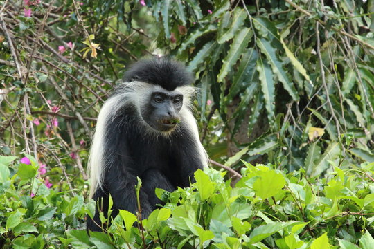 Il colore predominante è nero, ma ai lati del muso e sulle spalle il pelo è bianco e lungo e anche la coda termina con un fiocco bianco. Come tutti i colobi è privo di pollici.